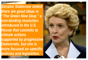 In addition, it should be mentioned that Senator Stabenow will not endorse the Green New Deal. In a recent MLive article it states: