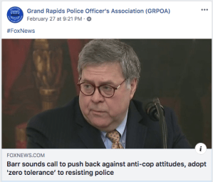 The GRPD police union, the Grand Rapids Police Officers Association, liked so much what Barr had to say, they posted a Fox News story about the speech in late February on their Facebook page.