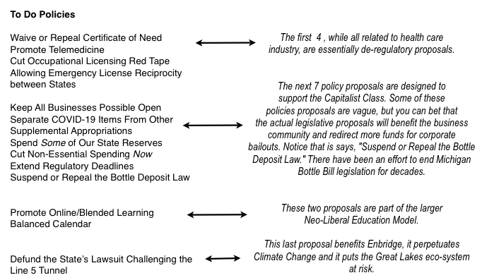 As you can see, the COVID-19 Coalition policy Do’s and Don’ts are not only dangerous, they are clearly designed to push a Neo-Liberal Capitalist wish list during the current pandemic. The Capitalist Class would like us to be distracted with how they are “helping” during the COVID-19 crisis, because what they are hoping to do under the radar will not only widen the wealth gap in Michigan, it will further push a de-regulation and anti-environmentalism.