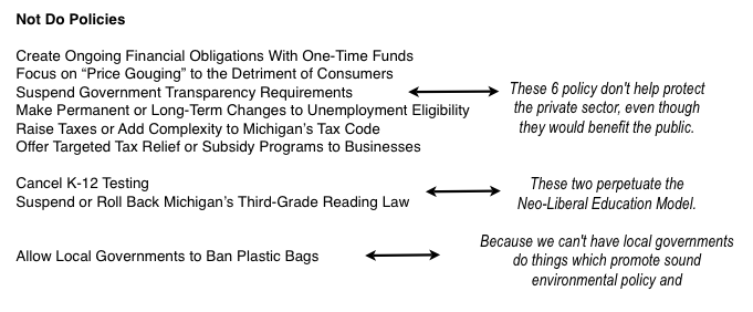 This COVID-19 Coalition, which should more honestly be called a Disaster Capitalism Coalition, is calling for major policy changes in the state of Michigan. In true Orwellian fashion, this coalition is naming their work as a Blueprint for Health, Safety and Economic Opportunity. This new coalition is calling for states policies that Michigan should enact and policies they should NOT enact.