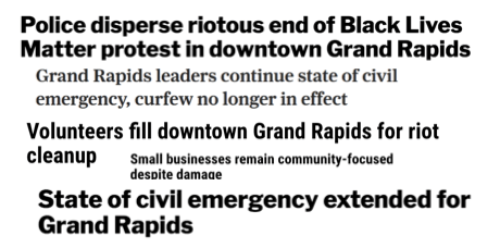 Therefore, I thought it would be useful to look at how 4 of the largest daily news sources in Grand Rapids have been reporting on the protests in town since Saturday, May 30 through the June 3rd protest in Grand Rapids. This is only 5 days of coverage, but it can tells us a great deal about how the commercial news media has been framing the protests and how they influence public perception, particularly white consumers of local news media, which are still the majority in West Michigan.