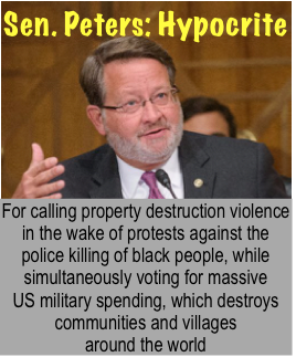Michigan Senator Gary Peters condemns anarchists for property destruction while he consistently votes to approves massive US military budgets which murder thousands of civilians around the globe annually