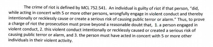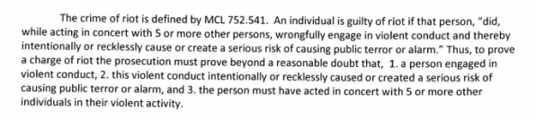 On page two of this document, one can read the legal language about why a riot is considered a crime. The language is very vague and as always allows the state a great deal of power to interpret what “causing public terror or alarm” actually means.