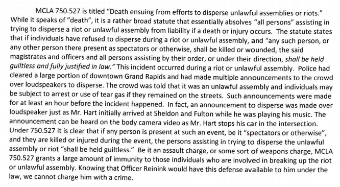 One major issue is how the Kent County Prosecutor interpreted the law in this case. WOODTV8 does provide a link to the document, which contains the legal decision made by the Kent County Prosector. People should read this document, since it provides a window into how so many laws that are adopted favor the police and limit the ability of the public to dissent.