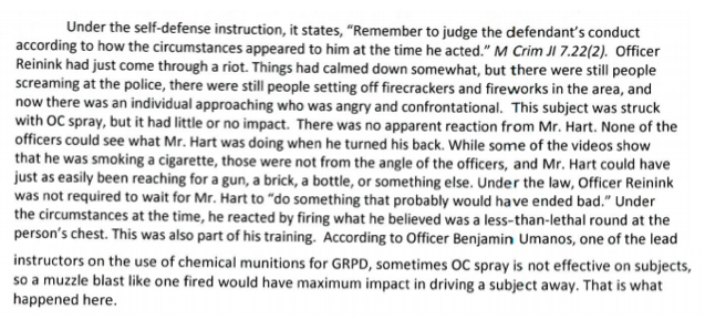 The Kent County Prosecutor then weights in on the cop who shot a civilian with the 40mm chemical round during the May 30 uprising. Again, the language of the law protects police behavior, even if that behavior does harm.
