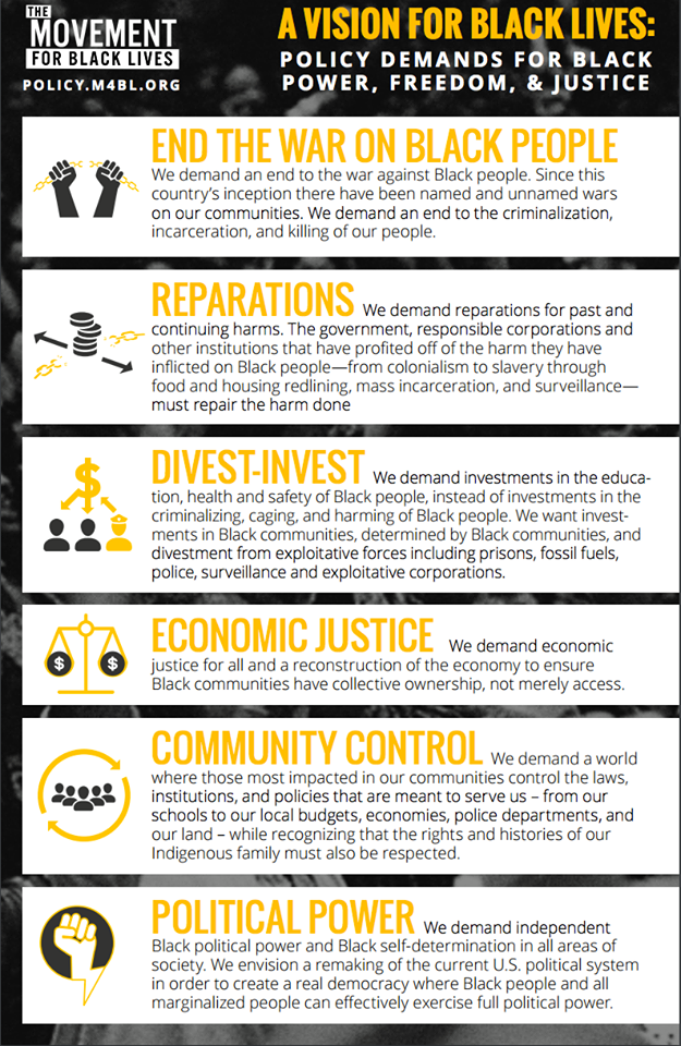 Community Control is one of the main components of the Black Lives Matter vision, which was crafted in 2015. Along with End the War on Black People, Reparation, a Divest/Invest component and Economic Justice, Community Control is central to this vision.