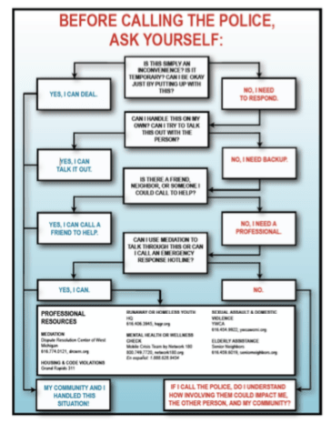 Fourth, having cops present with or partnering with mental health professional ultimately lends greater legitimacy to police departments and their bloated budgets. If the public was encouraged to call 311 instead of 911, police involvement would be reduced and the public would see that most conflicts can be resolved through non-violent means, whether that means that friends, neighbors or community professionals take initiative to provide the support that people need in a crisis or when there is a conflict. This is the exact kind of outcome that the Grand Rapids-based group Together We Are Safe has been advocating for over a year now, by distributing a document entitled, Before Calling the Police, Ask Yourself.