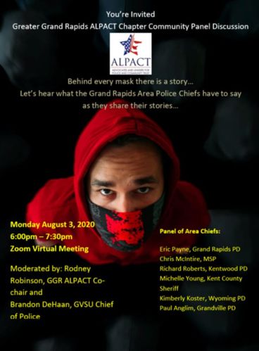 The panel will be moderated by someone with ALPACT and the GVSU Police. The panel includes six law enforcement agencies leaders, including GRPD Chief Payne, someone from the Michigan State Police, the Kentwood Police Department, the Kent County Sheriff, the Wyoming Police Department and the Grandville Police Department.