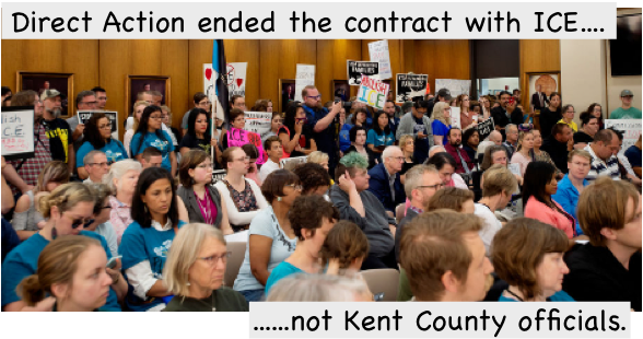 Those involved in demanding the end to the ICE contract were not deterred and continued to press their demands, with disruptions at more Kent County Commission meetings, protesting at the Commission Chair’s home, doing lots of education of the issue, holding marches, creating online petitions and actions at the Kent County Jail. In fact, after a little more than a year of direct action to End the ICE Contract, ICE officials decided to terminate the contract they had with Kent County in late August of 2019. What this all means is that elected county officials did nothing to end the contract with ICE. What ended the contract with ICE, was direct action and the involvement of thousands of people demanding immigrant justice.