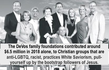 We argue, that the money the DeVos family foundations contribute ultimately compliments the direct political contributions they make. In Part II of this series, we look at the contributions the DeVos family foundations made for 2018 to Christian groups that would easily be considered part of the Christian Right – anti-LGBTQ, racist, practices White Saviorism, pull-yourself up by the bootstrap followers of Jesus.