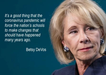On Friday, during an interview on SiriusXM Business Radio show, Wharton’s Business Daily, US Secretary of Education Betsy DeVos stated that “it’s a good thing that the coronavirus pandemic will force the nation’s schools to make changes that should have happened many years ago.”