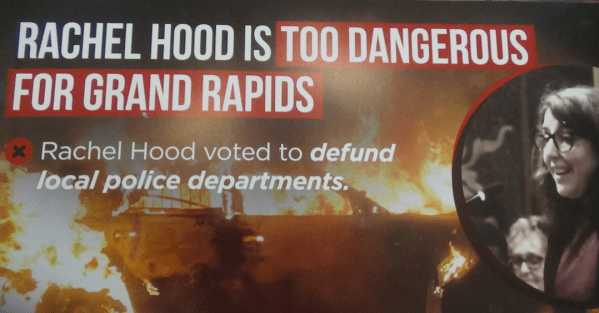 I received a misleading attack in my mailbox today, a mailer that was attacking State Representative Rachel Hood. Here is the front side of the ad, which has a picture of Rep. Hood, the image of a burning car, with the text that reads: Rachel Hood is too dangerous for Grand Rapids. Rachel Hood voted to defund local police departments.
