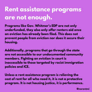 We understand that the non-profit housing groups are concerned about what will happen come January, when the eviction moratorium ends. However, instead of making demeaning comments about those who are facing housing insecurity, these groups should be acting in solidarity with people facing eviction or at least direct them to groups like the Grand Rapids Area Tenant Union, which centers the lived experience of tenants, since it is primarily made up of those who are tenants.