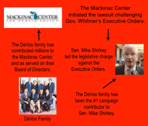 The legal challenge to Gov. Whitmer’s executive orders specific to the COVID 19 crisis was initiated by the far right think tank, the Mackinac Center for Public Policy, which has received lots of funding from several of the DeVos family foundations over the years, was responsible for making Michigan a Right to Work State, plus they have pushed for lots of other austerity measures and worked to undermine public sector unions for several decades.