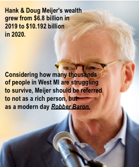 Between February of 2019 and October or 2020, the wealth of Hank & Doug Meijer grew from $6.8 billion to $10.192 billion, which is a pretty substantial increase, especially considering that the pandemic over the last 6 months has created millions of unemployed people, food insecure people and millions of people facing eviction. The amount of money that Hank Meijer is said to have contributed to the Congressional Leadership Fund – $150,000, is pennies compared to the Meijer family wealth. In fact, Meijer would have to contributed $150,000 a total of 67,946 times to equal their total wealth of $10,192,000,000.