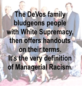 This is what the DeVos family has done for the past several decades and most clearly during the Trump era, the promotion of White Supremacy. Therefore, I ask you how can you even consider defending or supporting in any way the work that is being done in Grand Rapids through the numerous non-profits that that DeVos family contribute to? In addition, how can you support the numerous DeVos created entities that also operated in Grand Rapids, such as ArtPrize, AmplifyGR and Start Garden? The DeVos family bludgeons people with White Supremacy, especially Black people, and then offers entrepreneurial programs, as if to say, “your problems are not structural, you just haven’t been given the opportunity to shine.” This is managerial racism at its finest.