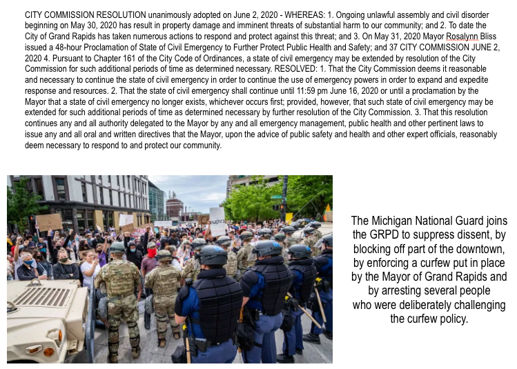 The links below provide more details for the visual timeline, with analysis of what has happened since the May 30th rebellion in Grand Rapids.