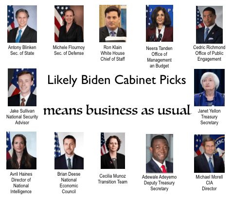 The graphic we put together here, includes some of the more prominent Biden cabinet picks. Of course, these are just nominations and the Senate, if controlled by the GOP, could block even these establishment picks. If that happens, it is possible that the next choices might be even more conservative and entrenched in systems of power and oppression.
