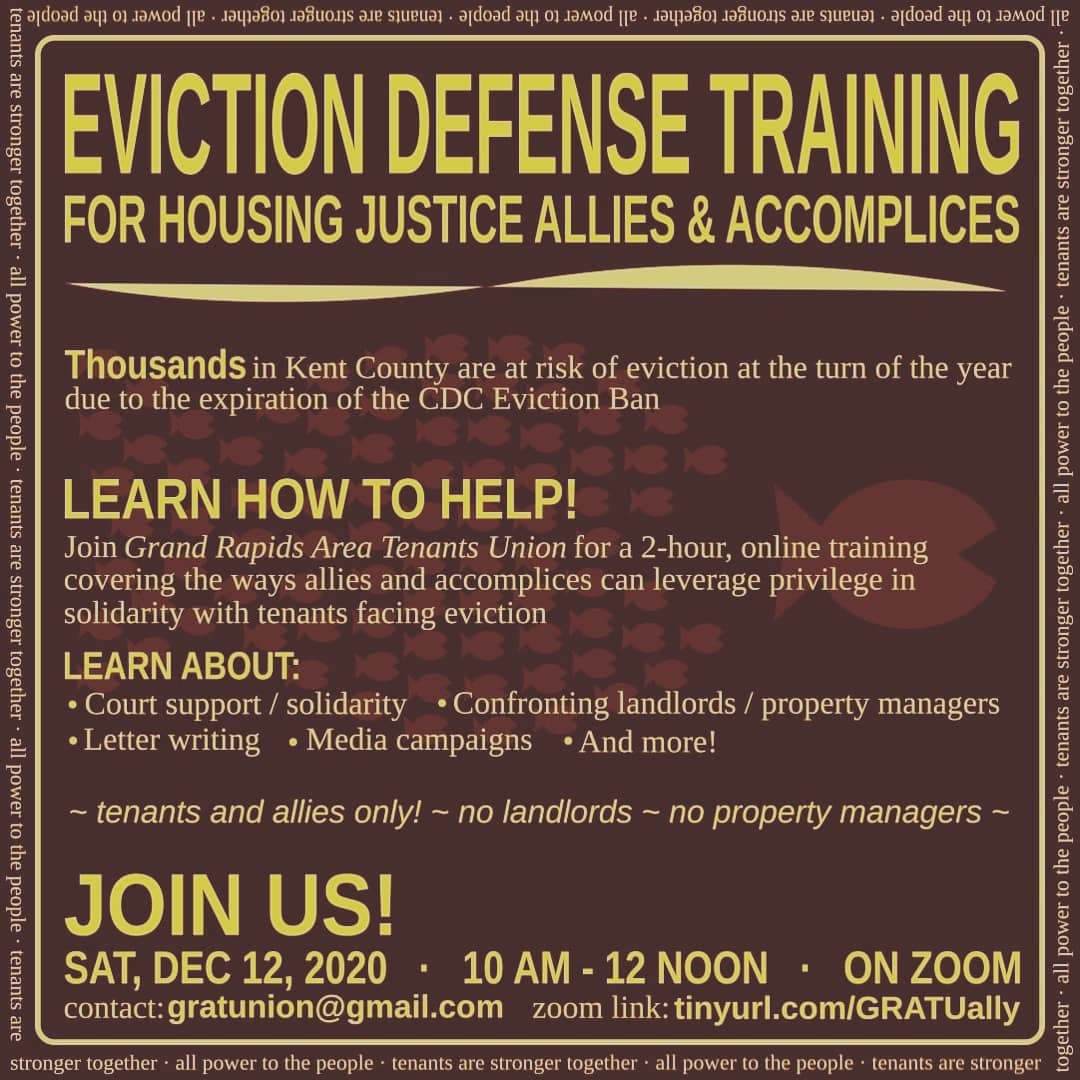 The Grand Rapids Area Tenant Union is hosting an online training this coming Saturday, (December 12th) for those who want to be involved in Eviction Defense.