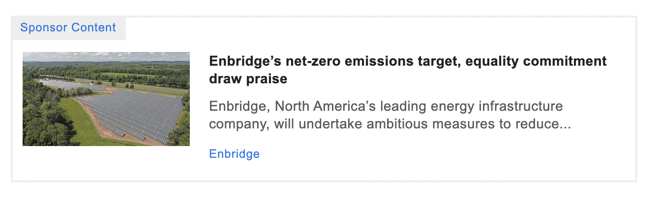 The sponsored content from Enbridge is simply a propaganda piece talking about how the company will reduce greenhouse gas emissions in their production process. The paid content by Enbridge also wants you to believe that their involvement in the One Future coalition demonstrates their commitment to sustainability.