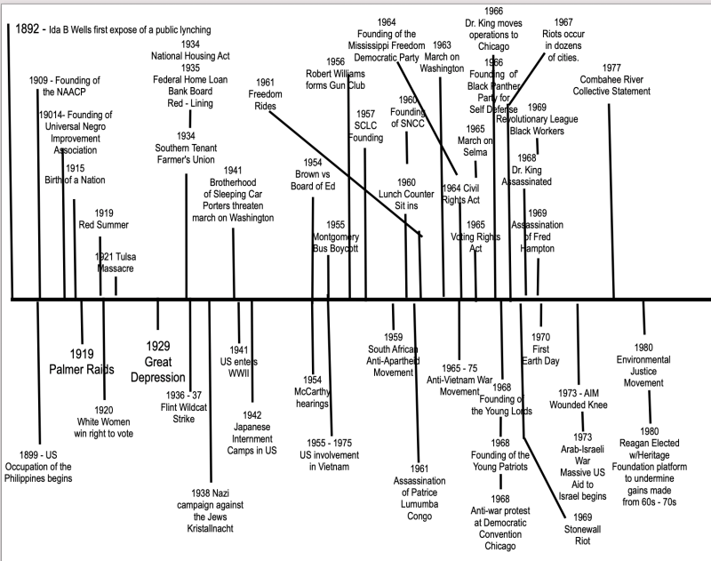 In the class we used a timeline of the 20th Century, which had critical points of the Civil Rights Movement/Black Freedom Struggle on the top, along with other important aspects of that century, which were connected to this struggle, which were listed on the lower half of the timeline shown here.