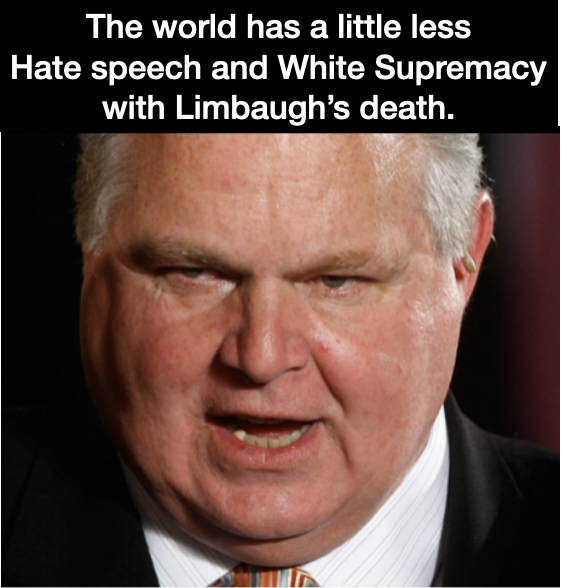 Rush Limbaugh was one of the court jesters of the US Empire and I will not mourn his death, instead I will celebrate the fact that there is one less amplified voice for hate and White Supremacy.