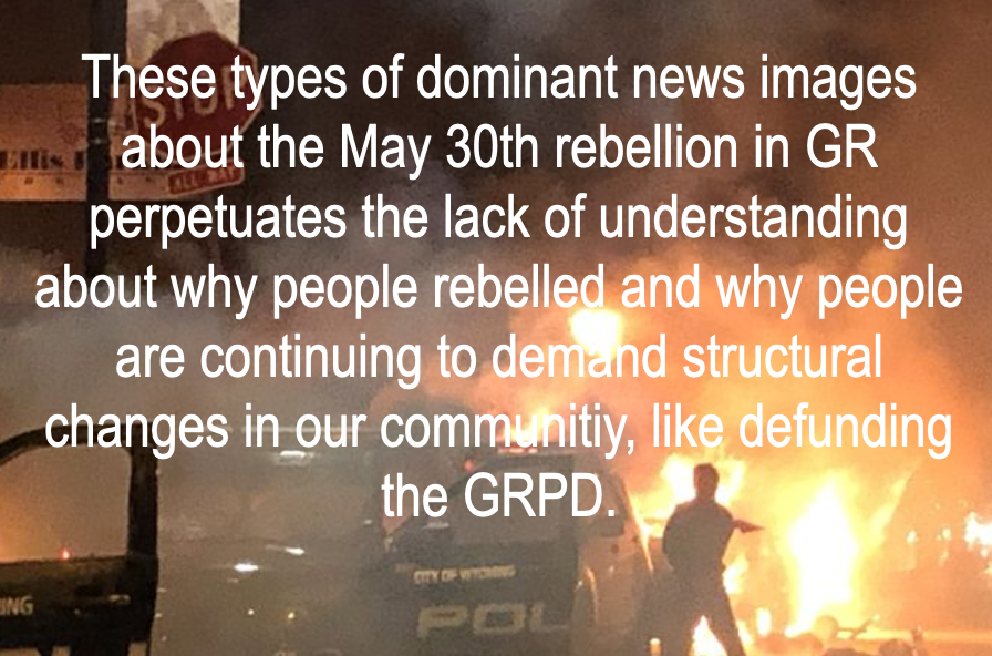 It’s easy for the local dominant news sources to paint those who are calling for a defunding of the GRPD as being violent or desiring chaos. However, what we know is that those involved in Defund the GRPD is that while calling for the defunding and eventual abolition of policing, they are also calling for community control of public safety and a redistribution of police funds to communities directly affected by policing. This means that while groups like Defund the GRPD are calling for a dismantling of systems of oppression, they are simultaneously calling for a redistribution of wealth, resources and a re-imagining of what community safety could look like. Unfortunately, the dominant news media doesn’t provide us with this sort of a narrative.