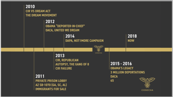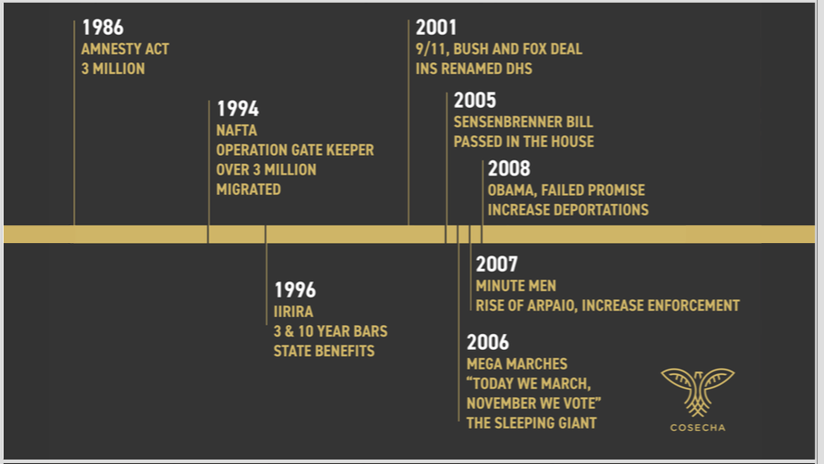 It was in this context that the immigrant justice movement was born. We used a timeline that Movimiento Cosecha GR uses when they do trainings on this topic, which are included here.
