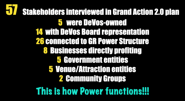 After that, we want to organize the 57 entities under the following groups: DeVos family run, other entities that make up the Grand Rapids Power Structure, entities with DeVos family representation on its board of directors, businesses that would profit from the Grand Action 2.0 development plans, government entities, stakeholders that were included because of their tourist appeal, and stakeholders that were included because they represent the optics of community.