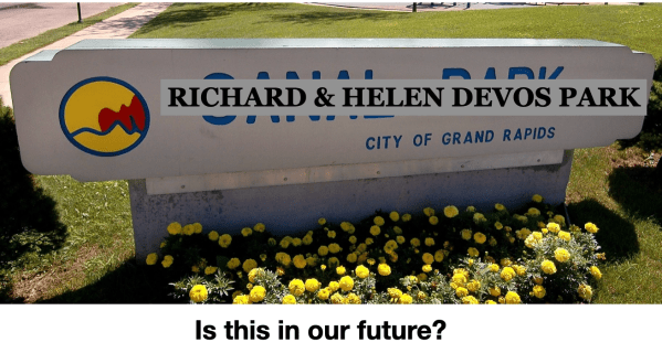 When reading this, the only thing that I could think of was that the City is willing to consider naming or renaming public spaces based on financial contributions, which almost always means from those who are part of the Grand Rapids Power Structure. Does this mean that we might see in the not too distant future a park or other public space being named after Richard & Helen DeVos? It certainly seems possible, since on page 69 it references naming right for Benefactors – members of the Capitalist Class, and corporations, associations, and other legally created entities making a major gift.