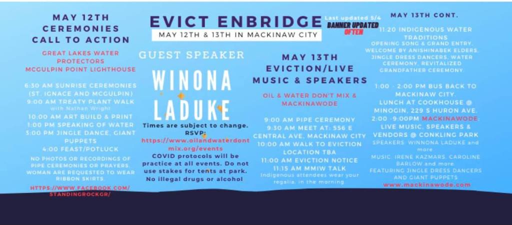 If you are unable to join this gathering on May 12, there is another opportunity on May 13th in both Lansing and Mackinaw City. The group Oil & Water Don’t Mix is inviting people. May 13th is the official deadline for the Enbridge Corporation to stop using their Line 5 pipeline.