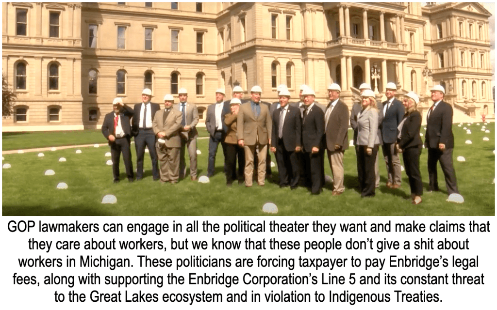 The amendment to pay legal fees to Enbridge passed 20 – 16, completely on partisan lines, with 20 Republicans voting for the amendment and 16 Democrats voting against it. The amendment was proposed by Sen. Ed McBroom, who represents Michigan’s Upper Peninsula. On May 11th, Sen. McBroom joined other members of the GOP on the lawn of the State Capitol for some public theater, claiming that shutting down Line 5 would take away jobs, as can be seen in the video here.