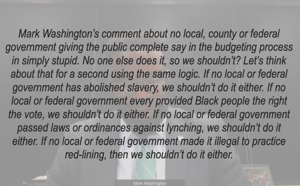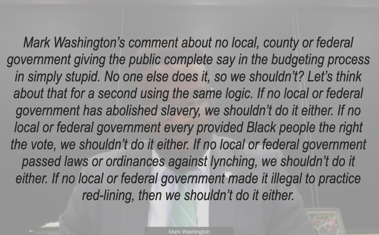 Secondly, Washington’s comment about no local, county or federal government giving the public complete say in the budgeting process in simply stupid. No one else does it, so we shouldn’t? Let’s think about that for a second using the same logic. If no local or federal government has abolished slavery, we shouldn’t do it either. If no local or federal government every provided Black people the right the vote, we shouldn’t do it either. If no local or federal government passed laws or ordinances against lynching, we shouldn’t do it either. If no local or federal government made it illegal to practice red-lining, then we shouldn’t do it either…….hopefully, you get the point.