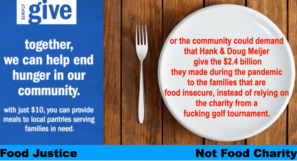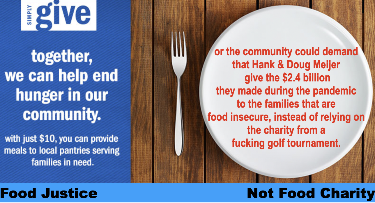 - This golfing event (and the Charity Industrial Complex as a whole) is normalizing the way in which society solves problems, which is through charitable efforts for the “less fortunate.” We are not allowed to ask the question, “why are so many people going hungry in our community.” We just have to accept that those who are “in need” are struggling because of some misfortune. We cannot be allowed to have any discussion that seeks to understand the root causes of hunger and the systemic forces that are the beneficiaries of hunger and poverty, like the Meijer Corporation. The normalization of food charity is particularly offensive during the COVID pandemic, which has seen a rise in people utilizing food charity services.