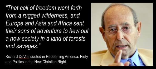 The image below includes a direct quote from Richard DeVos, which reveals his White Supremacist values, and his belief in Manifest Destiny.
