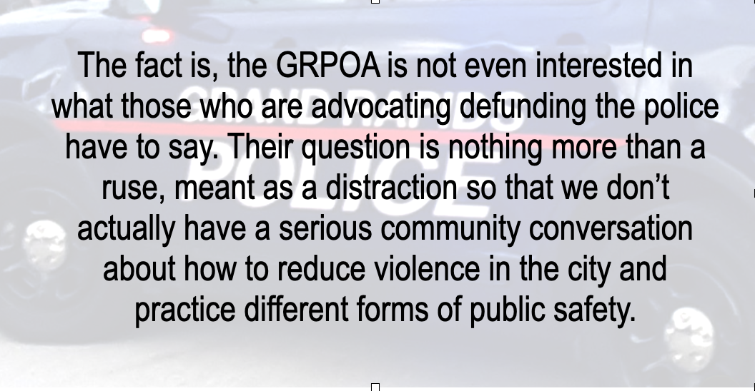 The fact is, the GRPOA is not even interested in what those who are advocating defunding the police have to say. Their question is nothing more than a ruse, meant as a distraction so that we don’t actually have a serious community conversation about how to reduce violence in the city and practice different forms of public safety.