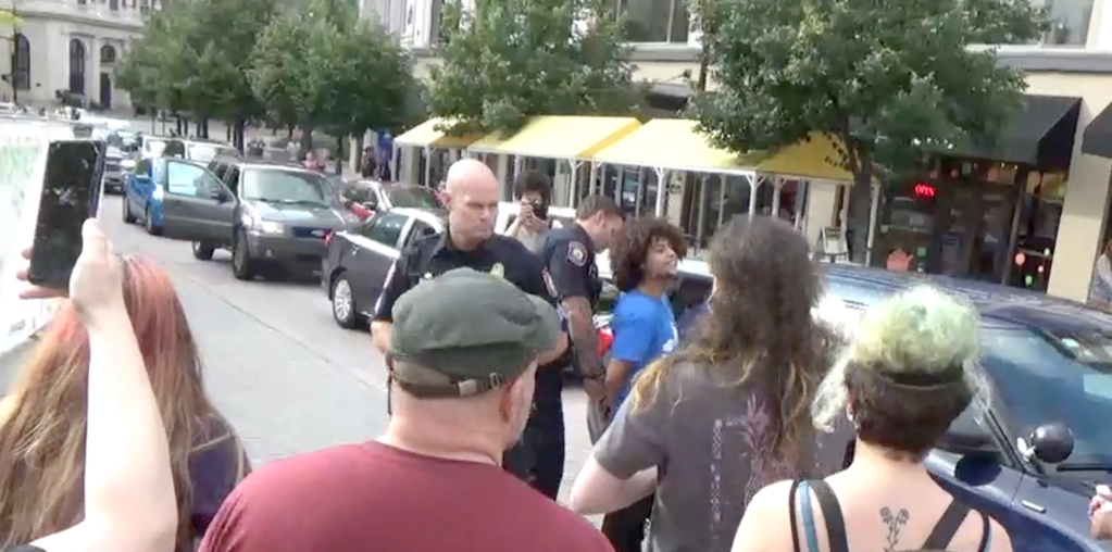 Realizing that the GRPD was there to grab Danny, several people then quickly surrounded Danny in an attempt to prevent the GRPD from grabbing him. One cop grabbed another person around the neck, throwing them to the ground and bloodying their knee. Some people were filming, while others chanted. Some of us were trying to get the names of the cops and their badge number and when we got “too close” to these cops, they yelled at us to step back or be arrested.