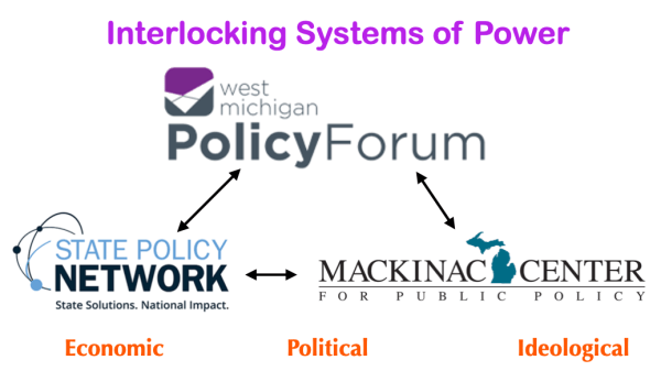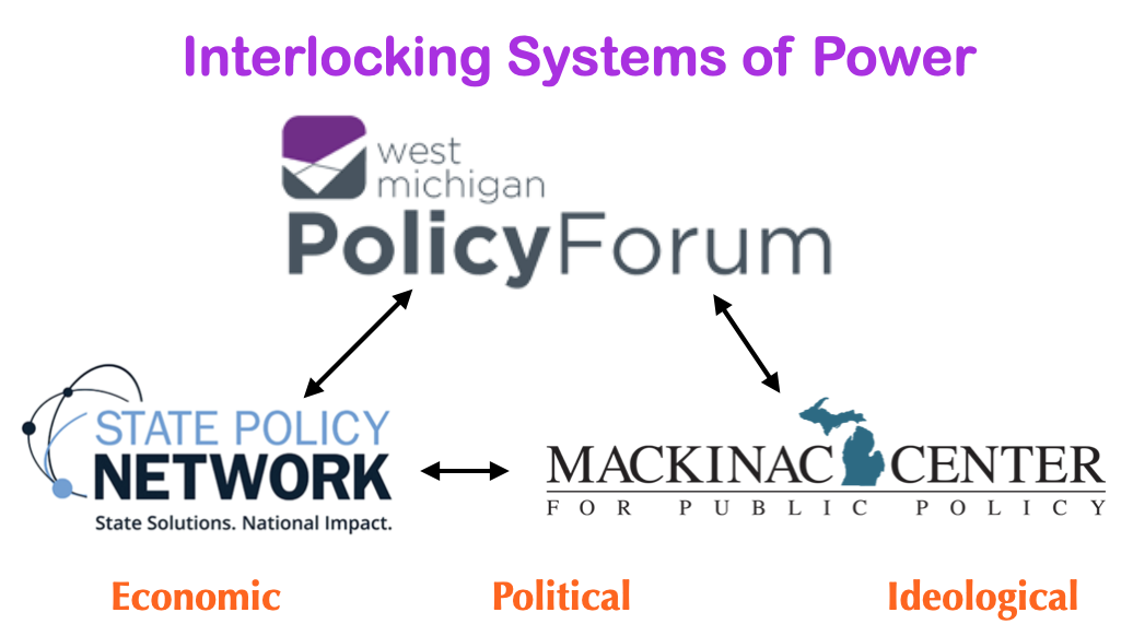 These types of inter-locking systems of power – financial, political and ideological – are a significant feature of the far right political movement in the US. Therefore, it is important for those of use who stand in opposition to these kinds of policy changes to be aware of how West Michigan-based groups like the West Michigan Policy Forum are connected to groups like the Mackinac Center for Public Policy and the State Policy Network, for the purposes of pushing a broad Neoliberal Capitalist agenda, which impacts most of the issues that grassroots & community-based organizers are working on.