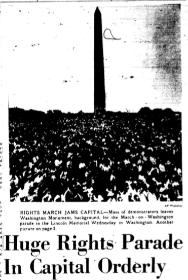 The first article on the march in August of 1963 (page 6) uses a photo of marchers with the Washington Monument in the background, with the headline that read, “Huge Rights Parade in Capital Orderly.”