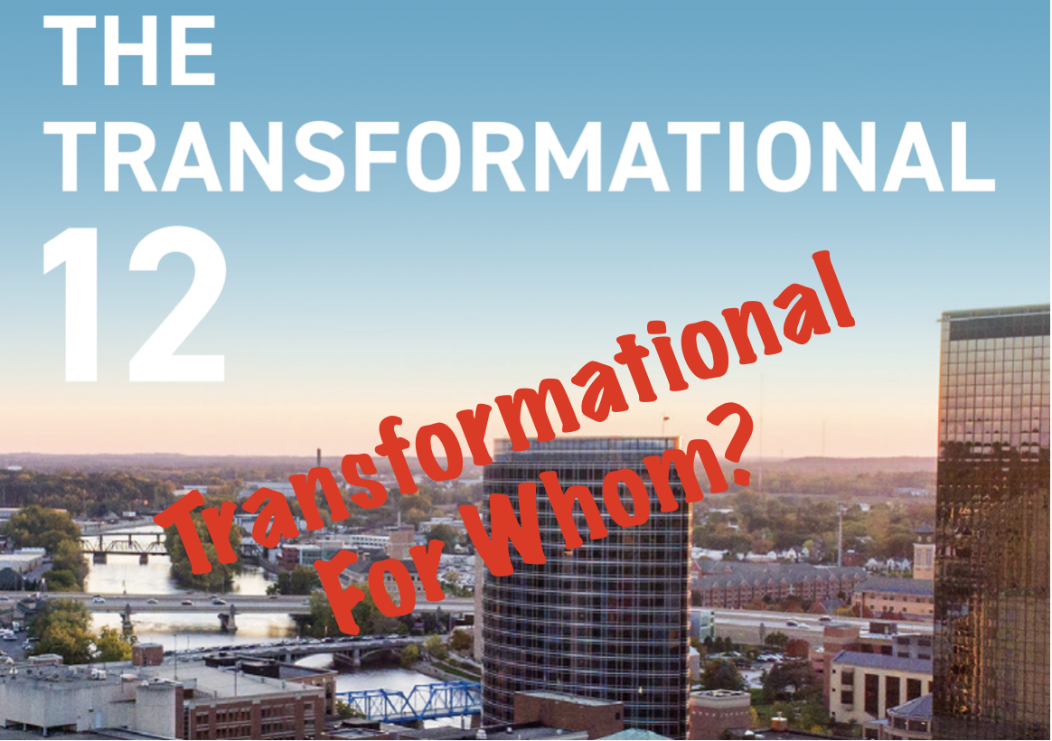 We interpret this text to mean that it will continue to solidify and expand economic benefits to white business owners that are already incredibly wealthy, it will rely on lots of public funding with no real public input, and it will expand the play area of downtown Grand Rapids for the white business class and their friends. The Transformational 12 will have little impact for those that are economically exploited and those which suffer the most under a system of White Supremacy.