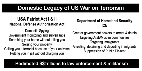 This history is important for all of us to come to terms with. This is especially the case for people who were too young to remember 9/11 or for those born since 2001. The legacy of 9/11 domestically has been even greater government capacity to repress and monitor Black, Indigenous and other communities of color, gather intelligence on all of us, along with providing greater government powers to suppress public dissent of any kind. These dynamics make it clear that we live in a police state.