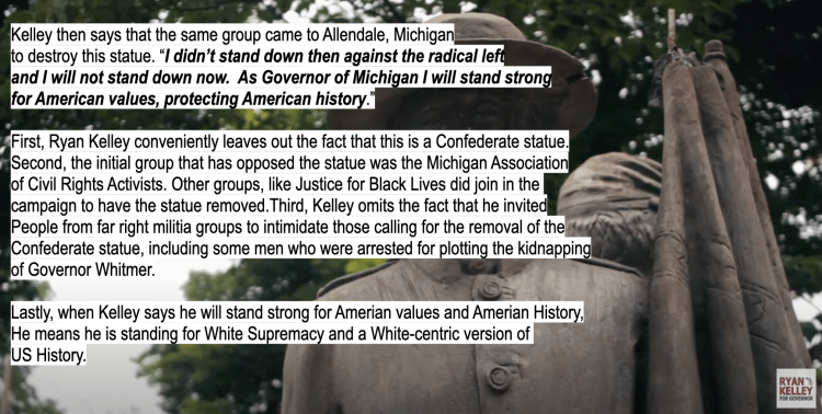 Lastly, it is clear that the only things Kelley can appeal to are the things he has personally been involved in, such as the anti-lockdown protests, the defense of the Confederate statue in Allendale, opposing COVID vaccinations and whining about the 2020 election results. All of these issues, it must be said, are wrapped in the ideology of White Supremacy, which is what Ryan Kelley has demonstrated he is committed to, since he became a public figure in April 2020.