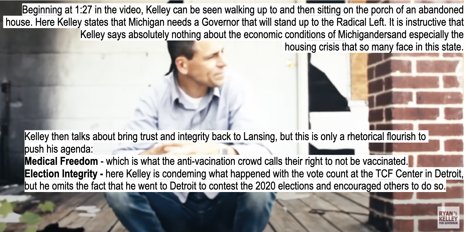 Like all political ads, Kelley uses vague rhetoric and appeals to traditional conservative values. However, Kelley also uses lots of misinformation, unsubstantiated claims and a great deal of fear-mongering, all of which have become the norm with political ads. More importantly, Kelley offers no concrete plans for what he would do that would actually benefit the majority of Michigan residents, specifically around economic policy, public health, the environment and housing.