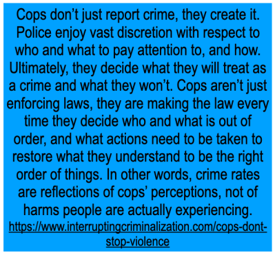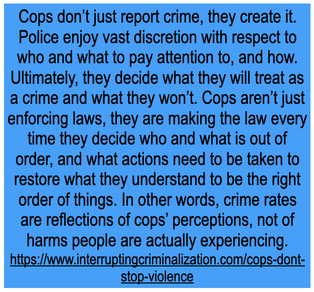 The second way that Rep. Wentworth provides a misleading comment is when he says that the GOP plans to “stand with them a find solutions together.” Besides the fact that Wentworth provides no concrete solutions, he doesn’t even clarify what the problem(s) are. If the problem is crime, as is usually the case coming from politicians, then they need to demonstrate that police funding actually prevents crime. According to a report by Interrupting Criminalization, police overwhelmingly do not prevent crime.