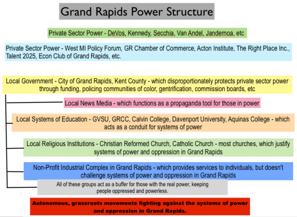 In today’s post, we want to look at the Grand Rapids Power Structure, which we define as the individuals, organizations and institutions that have tremendous influence over the lives of people in Grand Rapids, while maintaining systems of power and oppression to their benefit.