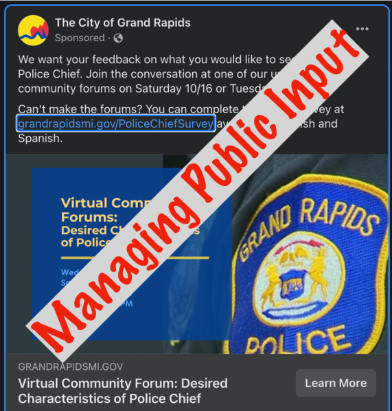 - Question why the City of Grand Rapids will only allow the public to have limited access to the Police Chief Candidates that have been pre-selected by Public Sector Search & Consulting Inc.