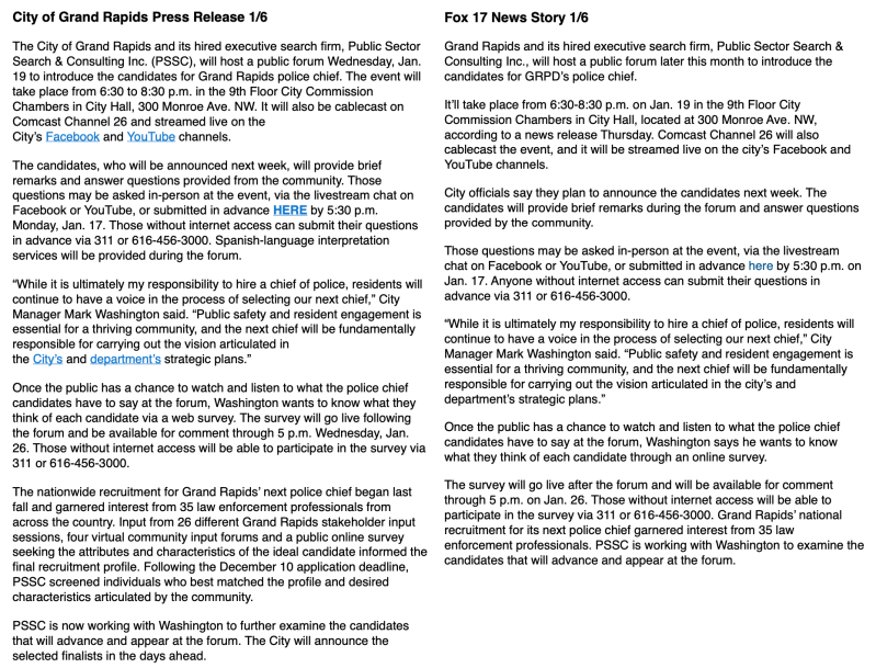 The most recent example is a City of Grand Rapids Press Release about a forum they are hosting to allow the public an opportunity to hear from a few of the pre-selected candidates to be the next Chief of Police in Grand Rapids. Both WOODTV8 and WXMI Fox 17 “reported” on the police chief forum, but both ended up running a version of the Press Release. Here we provide a side by side example of the City’s Press Release and the WXMI Fox 17 News story.