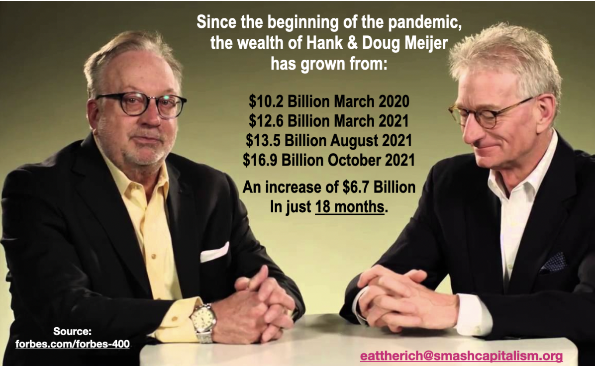 The MLive article quote the Meijer family attorney who stated that lena Meijer preferred to remain in the background, and to council members of her family. Do you think for a moment that Lena Meijer was counseling her sons Hank & Doug Meijer to pay the workers at Meijer stores a livable wage? No, she chose to not question how her son’s wealth went from $10.2 Billion at the beginning of the pandemic, to $16.9 Billion after the first 18 months of the pandemic. This means that the Meijer family business increased their wealth by $6.7 Billion, while Meijer workers couldn’t afford health care or pay their rent, and while thousands of families in West Michigan were suffering during the COVID 19 pandemic.