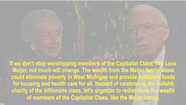 If we don’t stop worshipping members of the Capitalist Class, like Lena Meijer, not much will change. The wealth from the Meijer family alone could eliminate poverty in West Michigan and provide sufficient funds for housing and health care for all. Instead of celebrating the bullshit charity of the billionaire class, let’s organize to redistribute the wealth of members of the Capitalist Class, like the Meijer family.