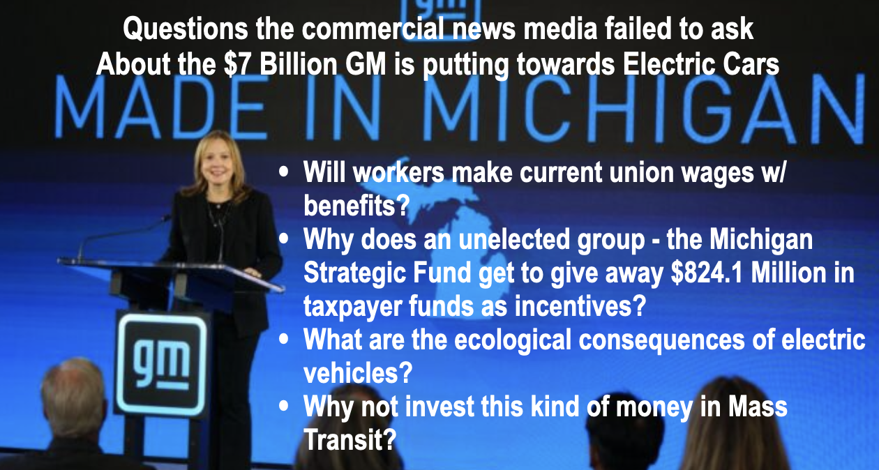 The commercial news media has been treating this announcement as good news for the state, with almost celebratory coverage across the board. What we don’t find in the reporting since this announcement, is much critical inquiry or even basic questions/information that might be useful to Michigan residents. Here are a few things to ponder with the GM announcement.